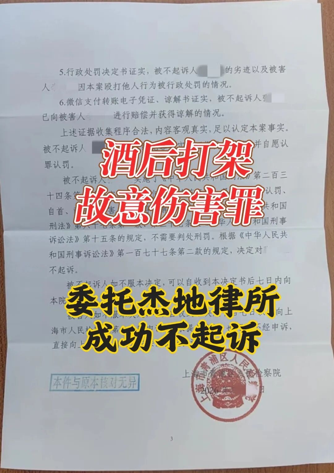 接受委托后,上海杰地律师事务所王珂、吴涛涛律师立即阅卷研判,结合故意伤害案件量刑核心要素(伤情程度、主观恶性、赔偿谅解情况),确定 “情节轻微、建议不起诉” 的辩护方向,重点提出以下核心意见: