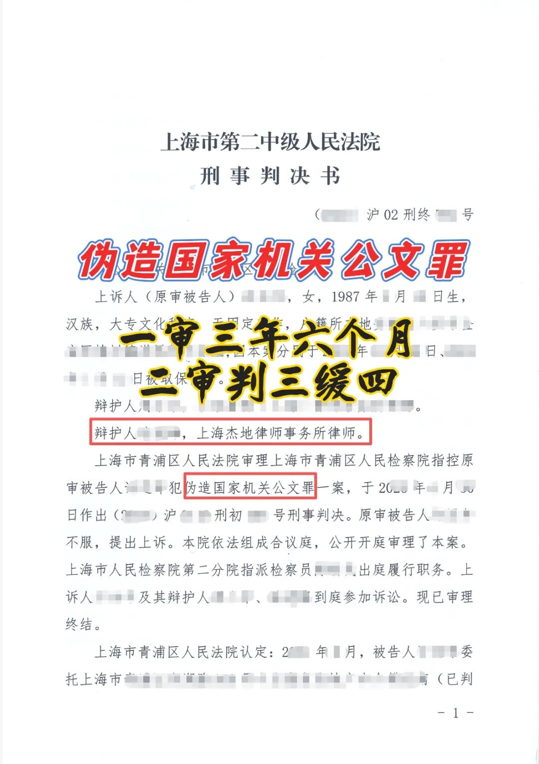 2023年,上海市青浦区人民法院一审以伪造国家机关公文罪,判处刘某有期徒刑三年六个月,并处罚金十万元。刘某不服量刑,以 “请求改判缓刑” 为由提出上诉,并委托上海杰地律师事务所介入二审辩护。
