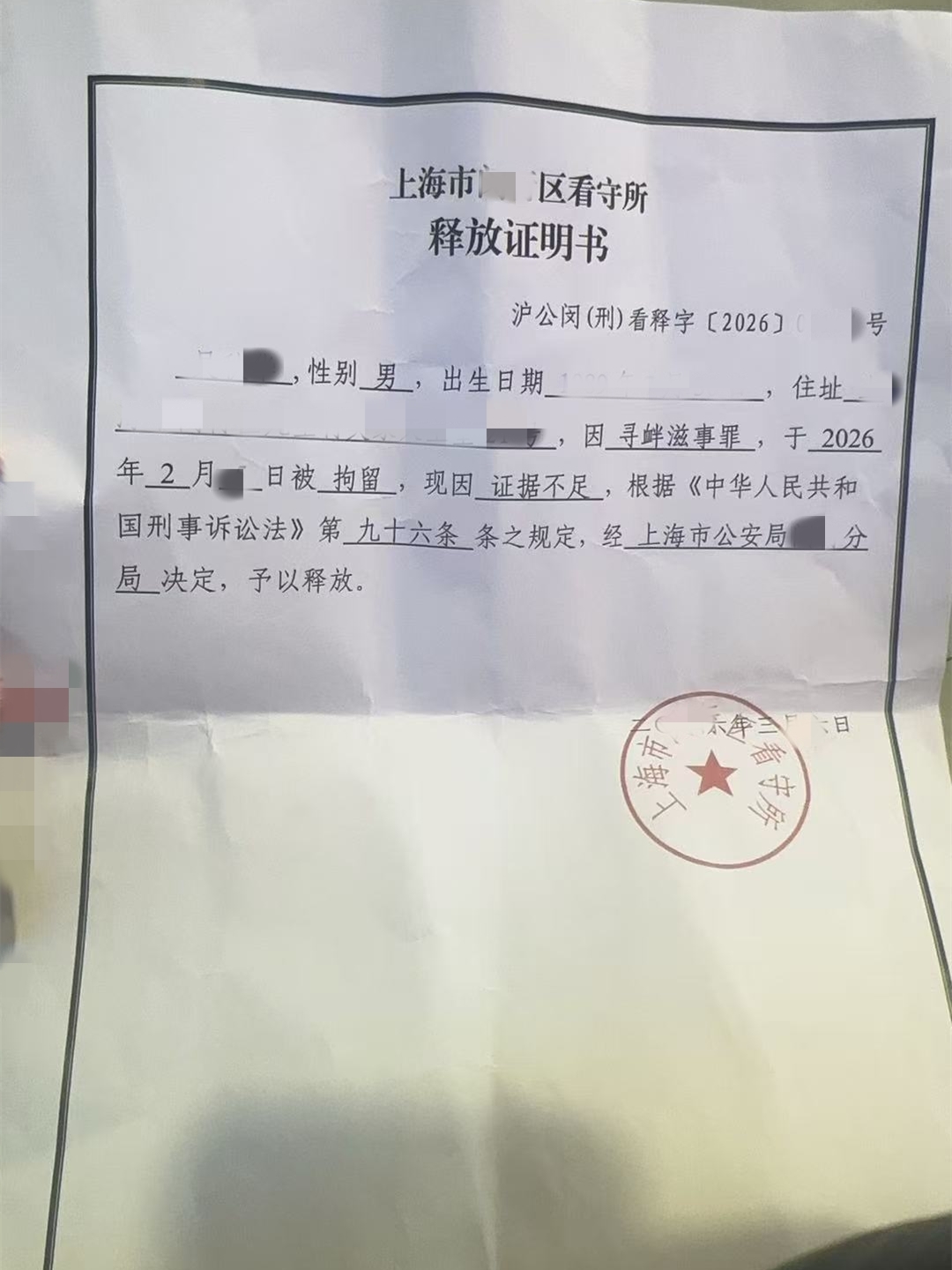 上海闵行区寻衅滋事案,成功实现证据不足释放。