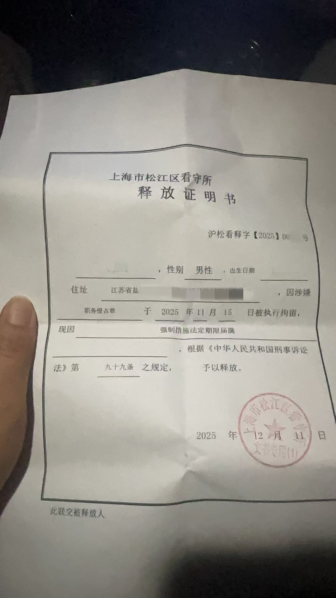 在律师的专业推动下,2025 年 12 月 11 日,当事人因强制措施法定期限届满,依法从上海市松江区看守所释放,重获人身自由。