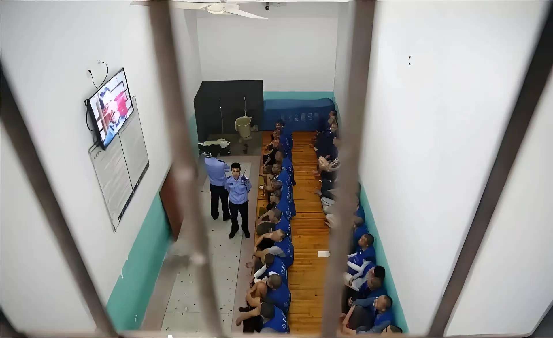 ▶早上6点起床,15分钟内完成内务与洗漱,7点用餐。上午学习监规、法律法规,期间穿插广播体操。